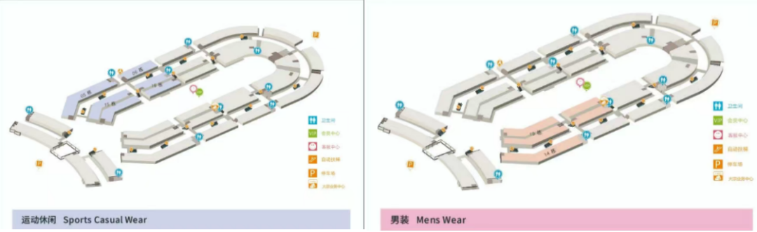 走过正门名品区后,左侧4栋为运动休闲区,涵盖NIKE、Adidas、SKECHERS、JEEP户外、New Balance、Columbia、THE NORTH FACE、UnderArmour、李宁、安踏、CAMEL等国内外运动休闲及户外品牌。右侧3栋为男装区,涵盖雅戈尔、九牧王、鄂尔多斯等男装品牌。