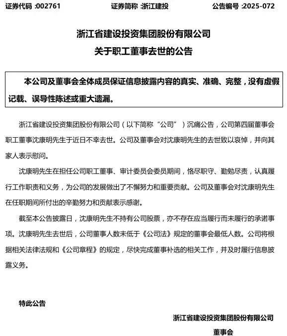 A股上市公司浙江省建设投资集团股份有限公司(证券代码:002761)发布公告称,该公司第四届董事会职工董事沈康明先生于近日不幸去世。公司及董事会对沈康明先生的去世致以哀悼,并向其家人表示慰问。