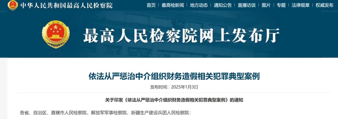 为全面贯彻习近平法治思想,深入贯彻落实党的二十届三中全会、中央金融工作会议、中央经济工作会议和全国检察机关刑事检察工作会议精神,进一步明确依法惩治中介组织财务造假相关犯罪中的法律适用和证据审查标准,切实提高案件办理质效,警示引导中介组织人员依法依规、尽职尽责履职,更好服务保障资本市场高质量发展,最高人民检察院选编了“苏某升等人提供虚假证明文件、出具证明文件重大失实案”等3件中介组织财务造假相关犯罪典型案例,现印发你们,供办案时参考借鉴。