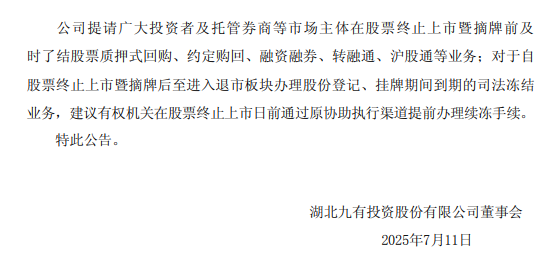 【退市整理】退市九有:关于公司股票进入退市整理期交易的第七次风险提示公告