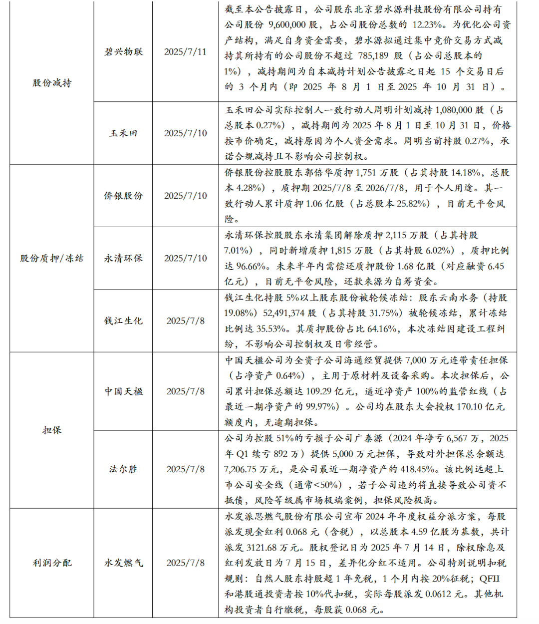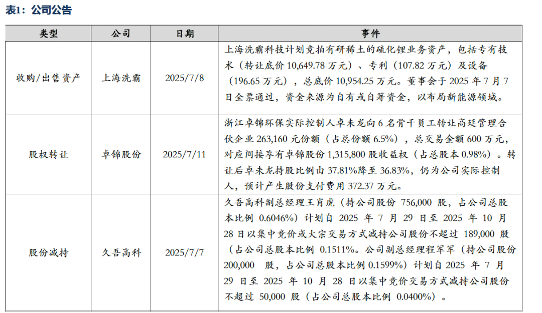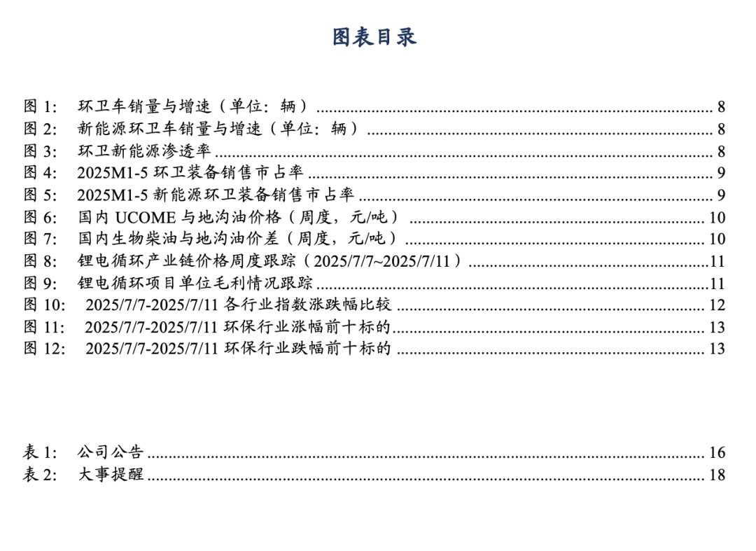 行业跟踪:1)环卫装备:2025M1-5新能源渗透率同增6.26pct至14.95%。25M1-5环卫车销量31237辆(同比+0.38%),其中新能源4671辆(同比+72.62%),盈峰环境/宇通重工/福龙马新能源市占率分别为32%/14%/8%。2)生物柴油:生物柴油均价持平,废油脂市场价格偏稳。2025/7/4-2025/7/10生柴均价8250元/吨(周环比持平),地沟油均价6200元/吨(周环比-0.3%),考虑一个月库存周期测算单吨盈利190元/吨(周环比-31.0%)。3)锂电回收:金属价呈上涨趋势&折扣系数总体呈上升趋势,盈利略有改善。截至2025/7/11,三元电池粉锂系数周环比上升,锂/钴/镍系数分别为69.0%/72.8%/72.8%。截至2025/7/11,碳酸锂6.38万(周环比2.4%),金属钴24.6万(周环比-3.1%),金属镍12.26万(周环比-1.1%)。根据模型测算单吨废料毛利-0.52万(周环比+0.027万)。