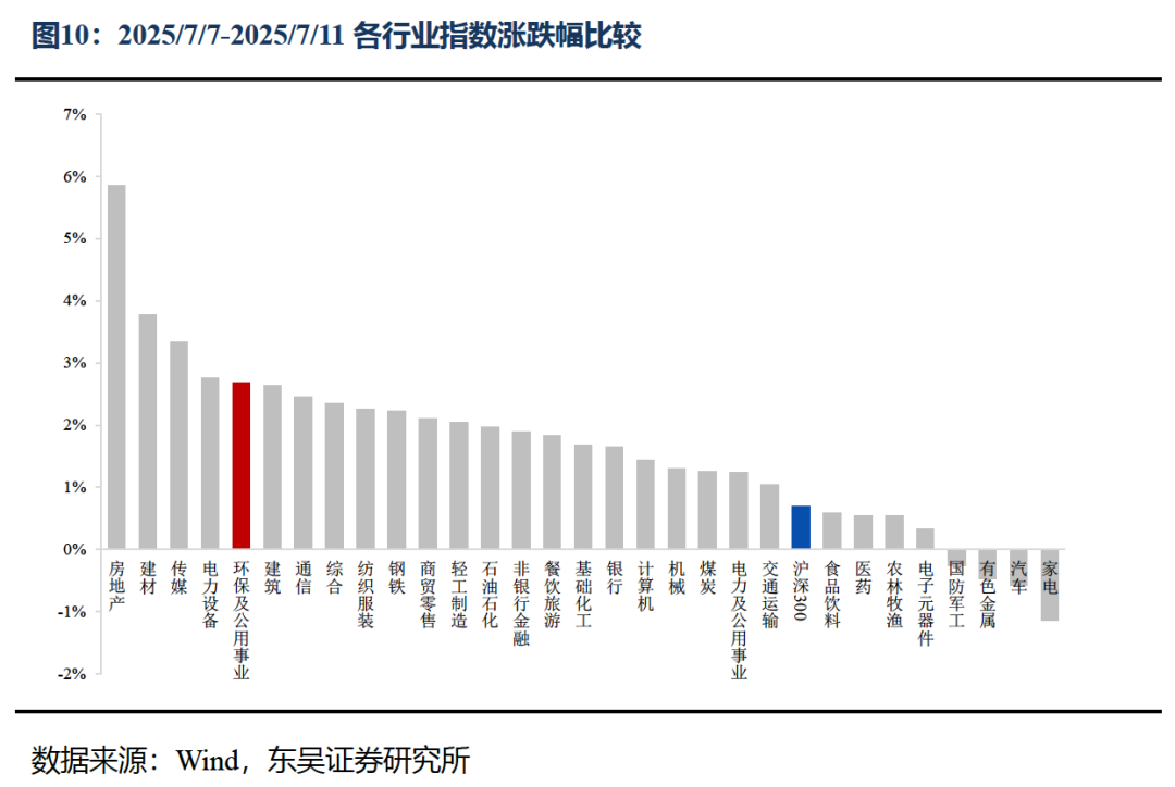 2025/7/7-2025/7/11本周环保及公用事业指数上涨2.69%,表现好于大盘。本周上证综指上涨1.08%,深证成指上涨1.16%,创业板指上涨1.55%,沪深300指数上涨0.7%,中信环保及公用事业指数上涨2.69%。