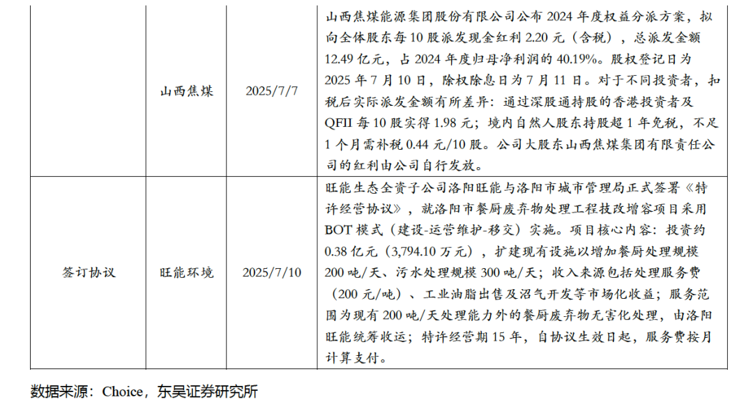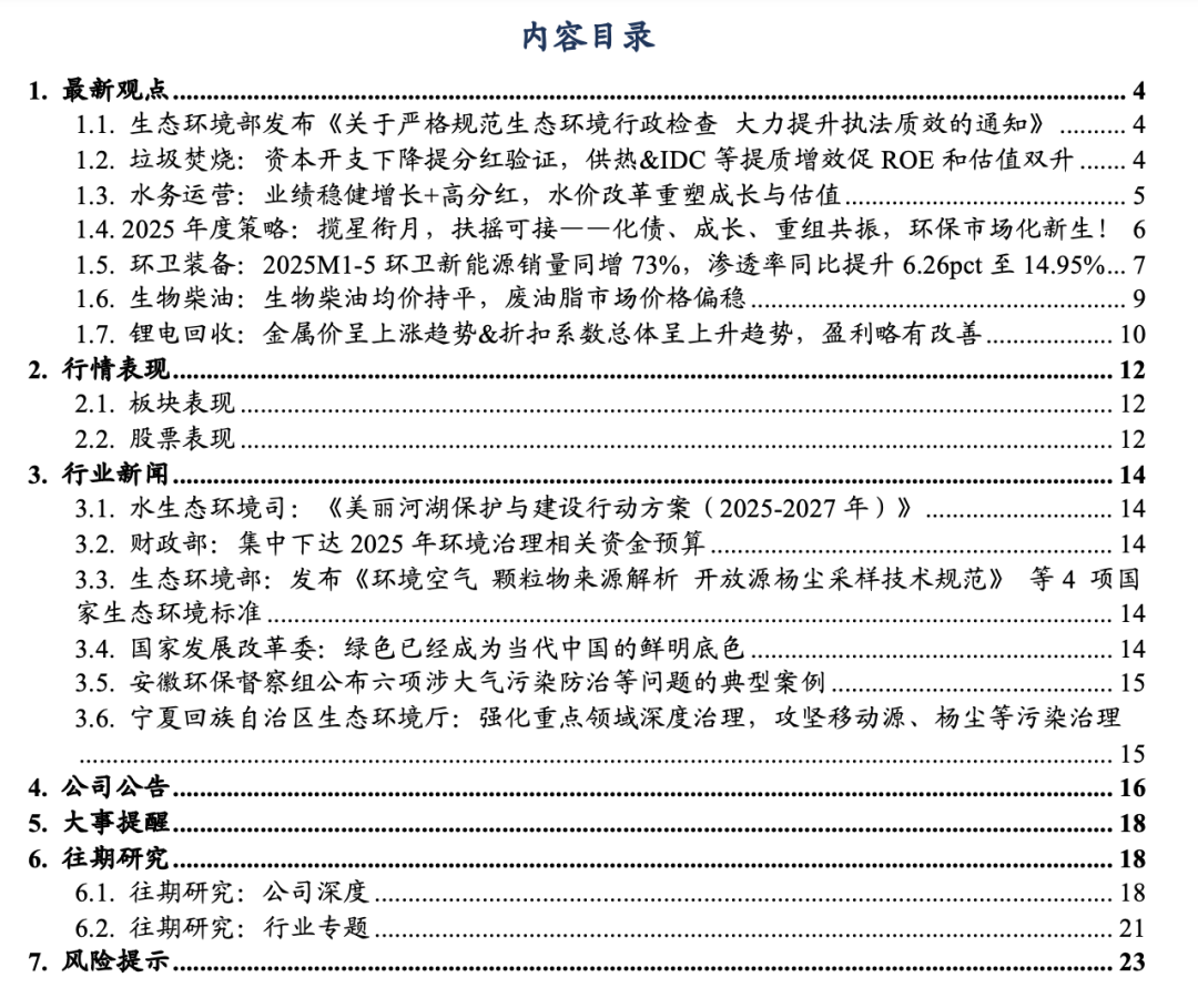 行业观点:【垃圾焚烧】资本开支下降提分红验证,供热&IDC等提质增效促ROE和估值双升!固废重点逻辑在于:一是资本开支下降,自由现金流大幅改善,分红提升!二是,行业成熟期提质增效!1)自由现金流增厚提分红:行业步入成熟期,资本开支下降,板块自由现金流于23年转正,24年持续增厚。政策要求推进垃圾处理计量收费,促商业模式C端理顺,改善现金流。提分红兑现:【军信股份】24年现金派息5.07亿元(同比+37%),每股派息维持0.9元,分红比例94.59%(同比+22.78pct),股息率4.1%;【绿色动力】24年现金派息4.18亿元(同比+100%),分红比例71.45%(同比+38.23pct),远超分红承诺底线,24年A股股息率3.9%,港股股息率6.5%;【瀚蓝环境】24年分红预案拟派息6.52亿元(同比+67%),分红比例39.20%(同比+11.83pct),股息率3.3%;【永兴股份】24年现金派息5.40亿元(同比+15%),分红比例65.81%(同比+2.12pct),股息率3.8%;【光大环境】24年派息14.13亿港元(同比+5%),分红比例41.84%(同比+11.33pct),24年股息率5.7%。测算分红潜力=(简易自由现金流-财务费用)/归母净利润。24年板块分红比例40%、稳态下分红潜力达97%~120%;预计26年标的分红潜力达50%~150%+。2)降本增效提ROE:成熟期资产不扩张,固废企业通过降本、供热、IDC合作等方式提质增效,带来ROE提升!如绿色动力25Q1归母净利润同增33%,供热量同增97%,25Q1加权ROE同增0.51pct至2.27%。垃圾焚烧+IDC为行业拓展新趋势,垃圾发电优势在于:清洁高效、稳定性、经济性、分布近城市中心;三种模式:纯供能模式/供能+机柜租赁/供能+算力租赁模式下,2000吨/日匹配20MW数据中心,盈利增量弹性为26%/66%/817%,综合ROE由12%提至16%/15%/18%;合作潜力:满足区位(京津冀、长三角、粤港澳、长沙)和规模(1000吨/日及以上)要求占总运营规模的比例:永兴97%、军信85%、旺能51%、绿动49%、伟明46%、瀚蓝45%(并购粤丰后)。【水务运营】业绩稳健增长+高分红,水价改革重塑成长与估值。2024年剔除一次性收益影响后板块业绩稳健增长,经营性现金流上行,资本开支下行。广州提价落实、深圳跟进,有望带动新一轮水价改革。价格改革不仅是弹性、重塑成长+估值!水的重点在于水价制度对合理投入回报的保障,从而在成熟期获得类似全球范式的持续增长,如美国水业业绩10年复增10%,伴随同样确定的红利增长。“从防御到可持续增长”带来估值提升空间2~3倍。重点推荐:【粤海投资】稀缺对港供水资产,能高频调价,历史年化涨幅2%且现金流优质,剥离粤海置地盈利修复,预计对应25年股息率6.6%,对应25年PE9.8倍。【兴蓉环境】掌握成都优质水务资产,项目投运+污水提价兑现,长期自由现金流增厚空间大,对应25年PE10.3倍。【洪城环境】自来水盈利承压,具备调价基础有待推进,高分红兼具稳健增长,承诺21-26年50%+分红,对应25年股息率5.2%,PE 9.7倍。建议关注:【联泰环保】国内污水处理领域的优秀民营企业之一,深耕长沙、汕头等区域市场,具备区域领先优势,2024年信用减值损失/归母净利润为-47%,受益于化债盈利修复弹性大。(估值日期:2025/7/11)