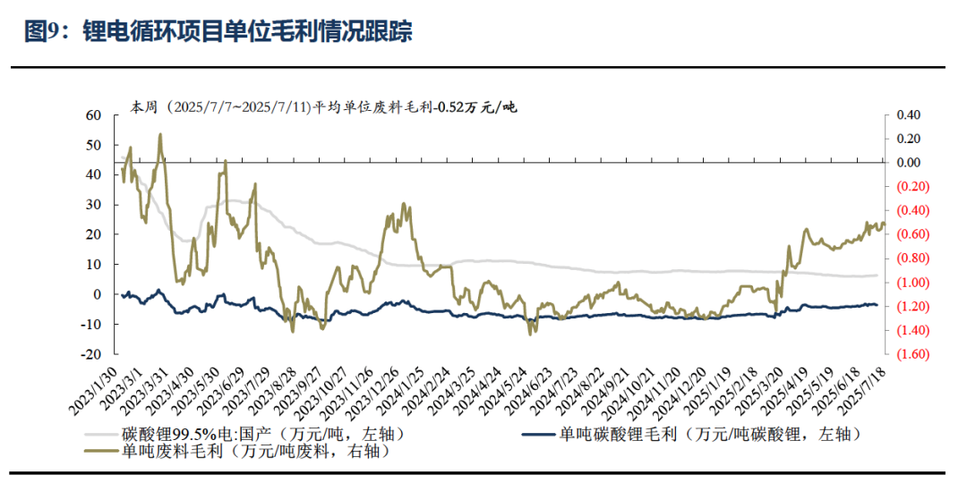 盈利跟踪:金属价格呈上升趋势&折扣系数总体呈上升趋势,盈利略有改善。我们测算锂电循环项目处置三元电池料(Ni≥15% Co≥8% Li≥3.5%)盈利能力,根据模型测算,本周(2025/7/7~2025/7/11)项目平均单位碳酸锂毛利为-3.25万元/吨(较前一周+0.17万元/吨),平均单位废料毛利为-0.52万元/吨(较前一周+0.027万元/吨),锂回收率每增加1%,平均单位废料毛利增加0.037万元/吨。期待行业进一步出清、盈利能力改善。