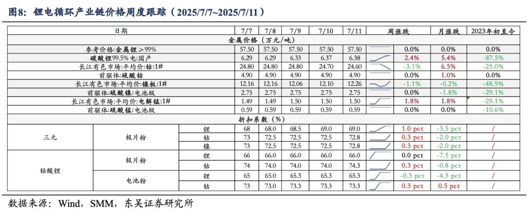 折扣系数基本不变。截至2025/7/11,折扣系数周环比。1)三元极片粉锂折扣系数69.0%,周环比变动1.0%;2)三元极片粉钴折扣系数72.8%,周环比变动0.3%;3)三元极片粉镍折扣系数72.8%,周环比变动0.3%。