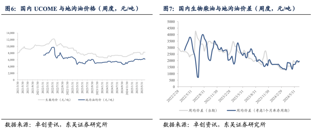 生物柴油均价持平,废油脂市场价格偏稳。根据卓创资讯,1)原料端:2025/7/4-2025/7/10地沟油均价6200元/吨,环比2025/6/27-2025/7/3地沟油均价-0.3%。2)产品端:2025/7/4-2025/7/10全国生物柴油均价8250元/吨,环比2025/7/4-2025/7/10生柴均价持平。3)价差:国内UCOME与地沟油当期价差2025元/吨,环比2025/7/4-2025/7/10价差+0.8%;若考虑一个月的库存周期,价差为2037元/吨,环比2025/7/4-2025/7/10价差-3.6%,按照(生物柴油价格-地沟油价格/88%高品质得油率-1000元/吨加工费)测算,单吨盈利为190元/吨(环比2025/6/27-2025/7/3 单吨盈利-31.0%)。废弃油脂方面,废弃油脂市场价格偏稳运行,UCO终端外商需求有所好转,此外,国内SAF工厂采购较为积极,短期来看,地沟油、潲水油价格维稳运行为主。生物柴油方面,目前河北地区有部分厂家处于低开工状态,原料成本及终端需求相对稳定下,预计短期内生物柴油价格波动幅度不大,或持稳运行。