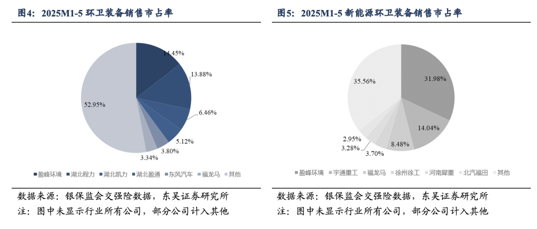2025M1-5环卫新能源销量同增73%,渗透率同比提升6.26pct至14.95%。根据银保监会交强险数据,2025M1-5,环卫车合计销量31237辆,同比变动+0.38%。其中,新能源环卫车销售4671辆,同比变动+72.62%,新能源渗透率14.95%,同比变动+6.26pct。