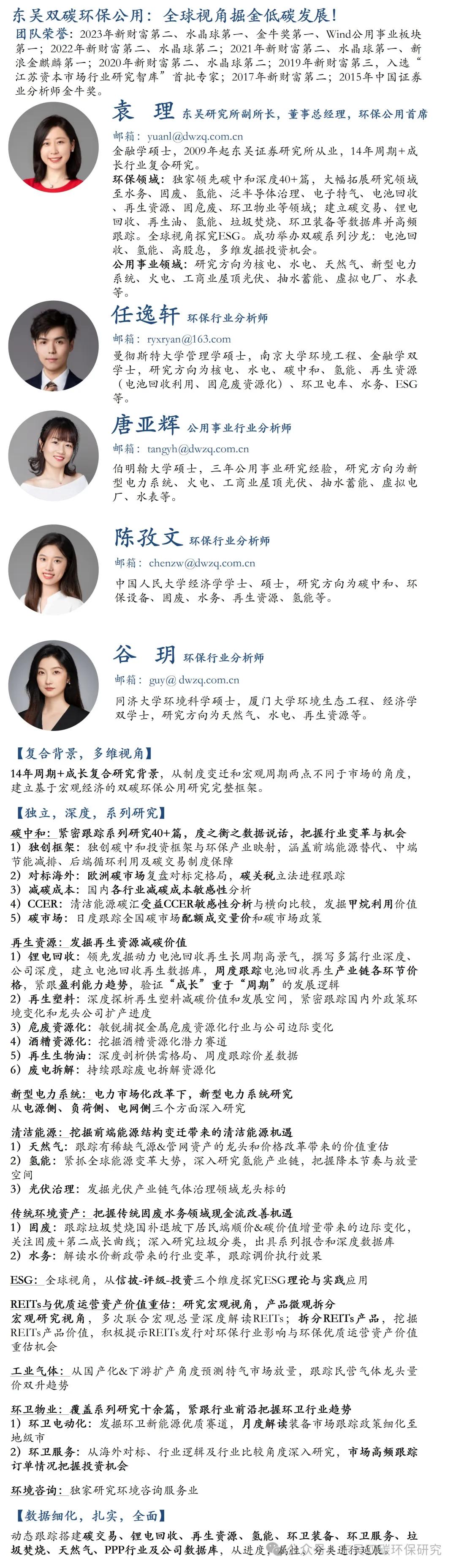 免责申明:本公众订阅号(微信号:dongwuhb)由东吴证券研究所环保团队设立,系本研究团队研究成果发布的唯一订阅号。本公众号所载的信息仅面向专业投资机构,仅供在新媒体背景下研究观点的及时交流。本订阅号不是东吴证券研究所环保团队研究报告的发布平台,所载内容均来自于东吴证券研究所已正式发布的研究报告或对已发布报告进行的跟踪与解读,如需了解详细的报告内容或研究信息,请具体参见东吴证券研究所已发布的完整报告。本订阅号所载内容不构成对具体证券在具体价位、具体时点、具体市场表现的判断或投资建议,不能够等同于指导具体投资的操作性意见。本订阅号所载内容仅供参考之用,接收人不应单纯依靠本资料的信息而取代自身的独立判断,应自主做出投资决策并自行承担风险。东吴证券研究所及本研究团队不对任何因使用本订阅号所载任何内容所引致或可能引致的损失承担任何责任。本订阅号对所载内容保留一切法律权利。订阅人对本订阅号发布的所有内容(包括文字、图片、影像等)未经书面许可,禁止复制、转载;经授权进行复制、转载的,需注明出处为“东吴证券研究所”,且不得对本订阅号所载内容进行任何有悖原意的引用、删节或修改。