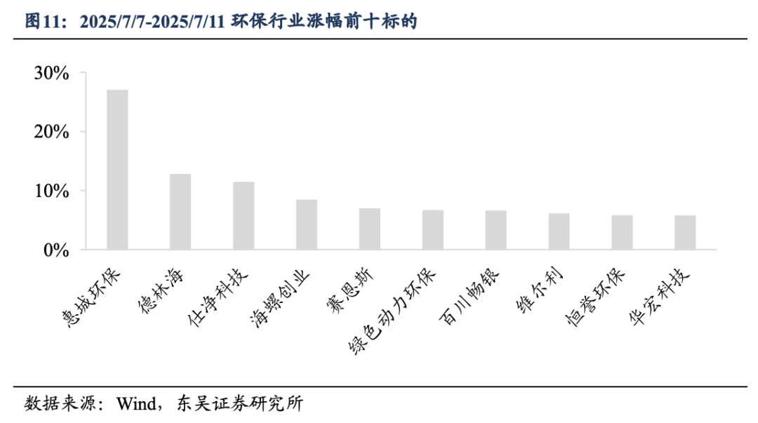 2025/7/7-2025/7/11涨幅前十标的为:本周涨幅前十标的为:惠城环保26.95%,德林海12.71%,仕净科技11.34%,海螺创业8.35%,赛恩斯6.89%,绿色动力环保6.57%,百川畅银6.52%,维尔利6.02%,恒誉环保5.69%,华宏科技5.67%。
