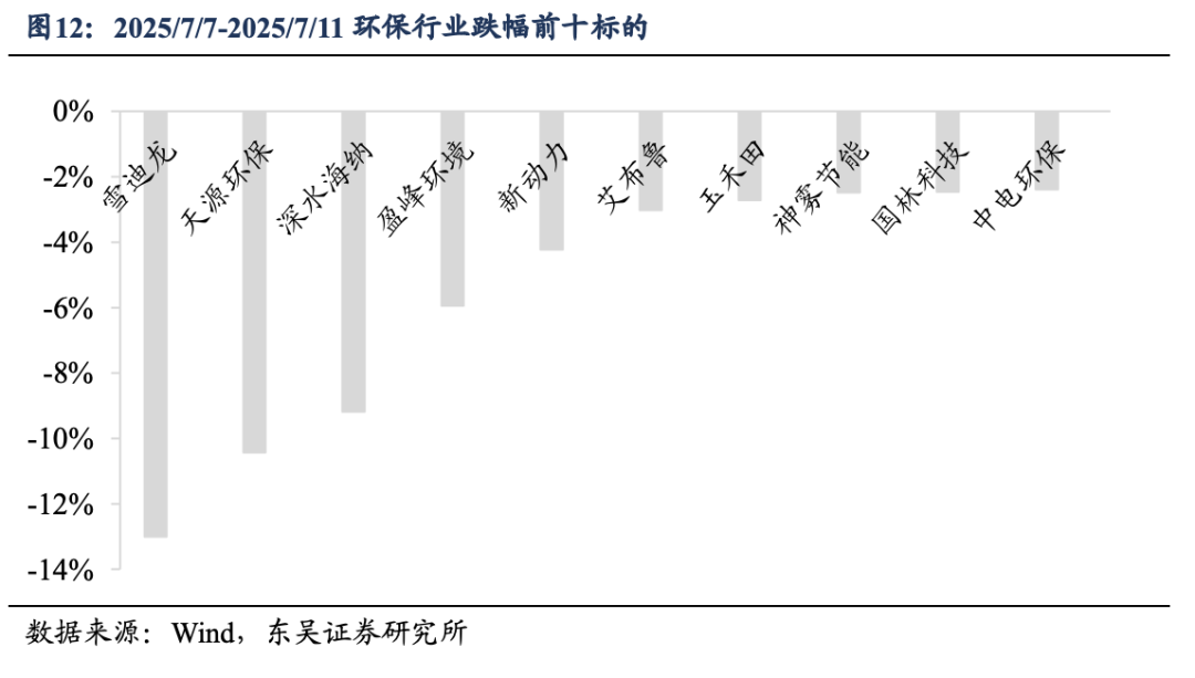 2025/7/7-2025/7/11跌幅前十标的为:本周跌幅前十标的为:雪迪龙-13.01%,天源环保-10.43%,深水海纳-9.19%,盈峰环境-5.94%,新动力-4.23%,艾布鲁-3.02%,玉禾田-2.72%,神雾节能-2.47%,国林科技-2.46%,中电环保-2.39%。