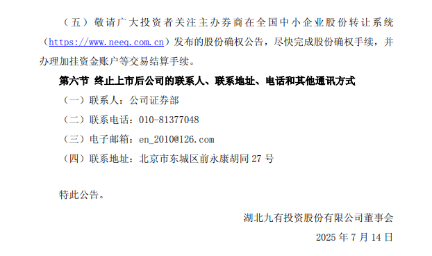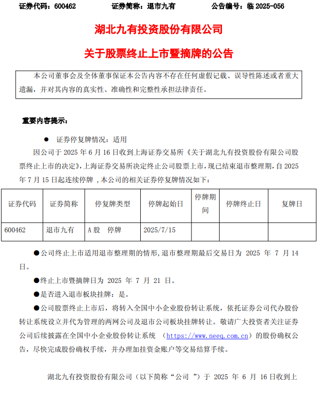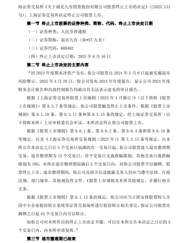 【摘牌公告】退市九有:关于股票终止上市暨摘牌的公告
