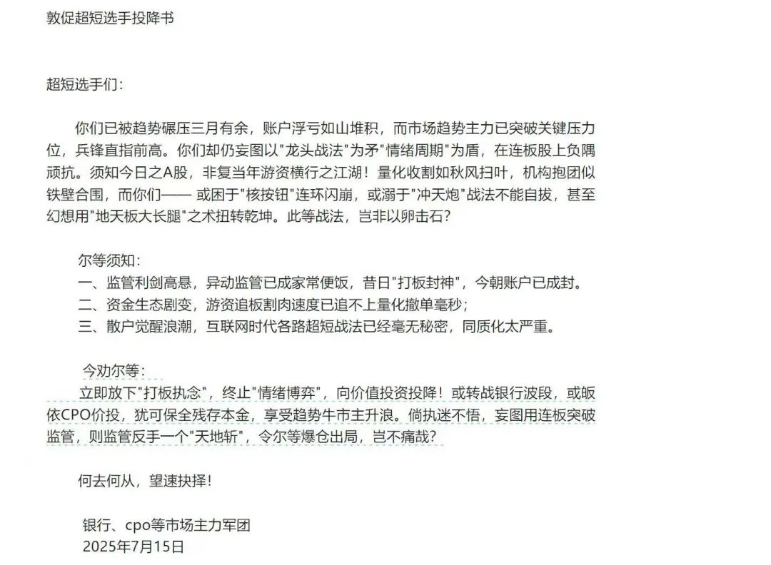 现在网上有“劝降书”,督促打板选手立即放下"打板执念",终止情绪博弈,向价值投资投降。确实,今年大游资收益被量化吊打,以前的龙虎榜,现在叫割肉榜!