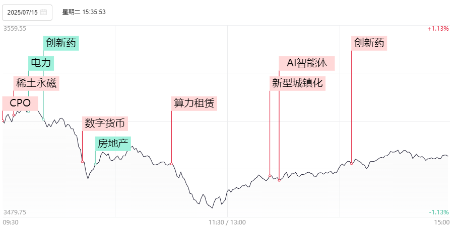 三大指数全天表现分化,收盘涨跌不一。截至收盘,沪指跌0.42%险守3500点,深证成指涨0.56%,创业板指涨1.73%。创业板50指数大涨超2%。两市个股普跌,下跌个股超4000只;两市全天成交1.61万亿元,较上一日放量成交1533亿元,内资主力资金净卖出524亿元;两市涨跌中位数为-1.07%。盘面上,市场情绪弱势,题材概念多数下行,亏钱效应明显。AI产业链全线爆发!光模块、液冷、铜缆高速连接等英伟达产业链领涨市场!新易盛、博汇股份20CM涨停,权重股中际旭创、胜宏科技涨超10%;智谱AI、多模态、AI智能体等AI应用概念午后走强,鼎捷数智、云鼎科技等多股涨停;云计算、算力、数据中心等算力产业链集体上涨;出海50、5G、智慧政务等少数概念表现强势。跌幅方面,两市跌停数量骤增至20余只!高位股上演跌停潮,国晟科技、联环药业等多股跌停;煤炭、电力、化工、有色金属等周期概念全线下挫,华银电力、拓日新能跌停;有机硅、光伏设备等光伏产业链回调,亚玛顿跌停;白酒、食品饮料等大消费概念全线走低;CRO、创新药、减肥药等医药概念集体弱势;常山药业跌超10%;银行、券商、保险等大金融板块回调;稳定币、军工产业链、农业、房地产产业链等均表现弱势。消息面上,1、英伟达公司创始人黄仁勋在接受总台央视记者采访时宣布:美国已批准H20芯片销往中国,英伟达将推出RTXpro GPU;2、新易盛预计上半年净利37亿元–42亿元,同比增长328%-385%;3、统计局公布数据显示,6月份,社会消费品零售总额同比增长4.8%;4、美国商务部正在调查无人机和多晶硅进口。