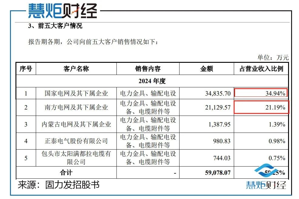 招股书显示,2022年至2024年,固力发前五大客户中电网类公司的销售占比分别为44.96%、53.44%、57.52%,其中对国网销售占比分别为30.77%、37.23%、34.94%,对南网销售占比分别为11.31%、14.42%、21.19%。