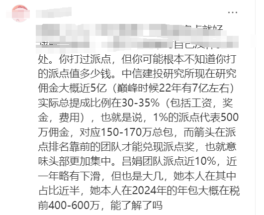在社区平台有网友还给吕娟算了一笔账,中信建投2024年派点价值5亿,提成比例大约30%,1%的派点就是500万,对应总包150万;而吕娟团队派点近10%,也就是团队薪酬在1500万左右,吕娟比如分哪怕1/3,也有四五百万的派点收入。