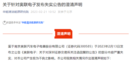 2月21日,华能清洁能源研究院亲自打假,发布针对奥联电子发布失实公告的澄清声明称,本公司与南京奥联汽车电子无任何合作协议、技术交流和业务往来。其公告中胥某简历中有关华能清能院的描述严重不实,胥某未曾受邀到访华能清能院,认证数据为杜撰数据。
