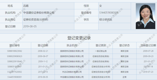 金石杂谈查询发现,中信建投机械首席目前在协会依然可查。吕娟,复旦大学经济学硕士,2008年2月至2017年1月就职于国泰君安证券研究所任机械首席分析师,2017年2月至2019年7月就职于方正证券研究所任董事总经理、副所长、机械首席分析师。