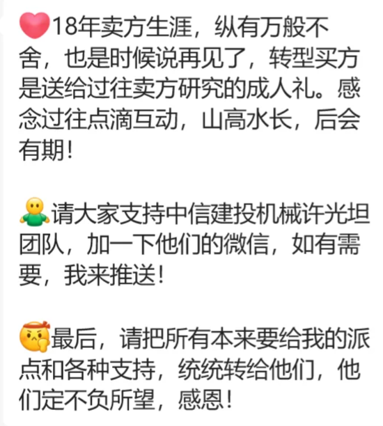 7月15日,中信建投首席吕娟疑似客户群发声:18年生涯,纵有万般不舍,也是时候说再见了,转型买方是送给过往卖方研究的成人礼。她还表示,请大家支持中信建投机械许光坦团队,加下他微信,请把本来要给我的派点和支持给他们,他定将不负众望。