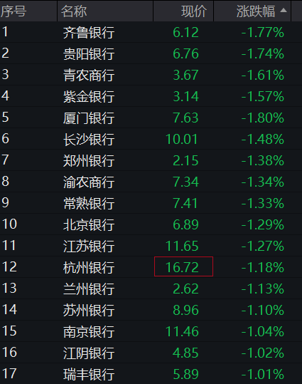 银行股继续走低,贵阳银行、齐鲁银行、厦门银行等跌幅居前。杭州银行跌超1%。