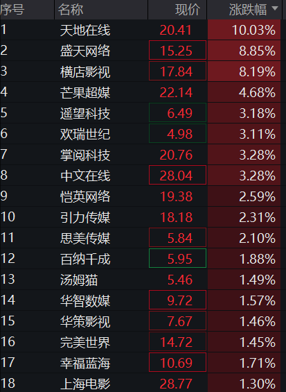 传媒、短剧概念股开盘走强,天地在线直线涨停,中国电影、福石控股、引力传媒、龙韵股份、世纪天鸿等跟涨。