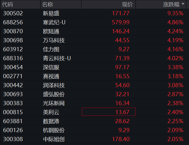 算力产业链再度走强,GPU、算力租赁等方向领涨,景嘉微、寒武纪、芯原股份等纷纷走高。