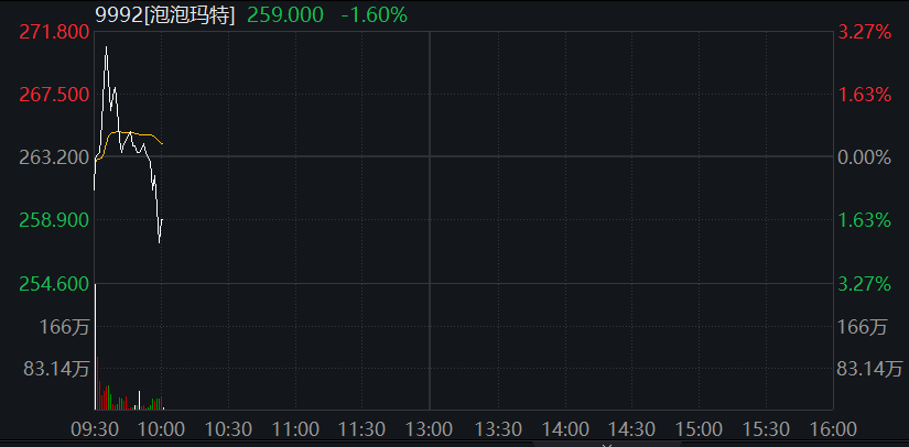 泡泡玛特冲高回落,截至发稿跌1.6%,此前一度跌超2%,报259港元/股。