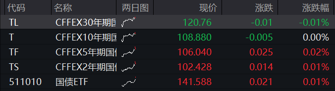 国债期货开盘,30年期主力合约涨0.05%,10年期主力合约涨0.02%,5年期主力合约涨0.01%,2年期主力合约涨0.01%。