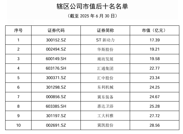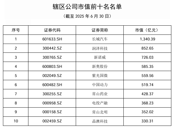 截至2025年6月30日,河北境内上市公司家数为82家,其中沪市26家(主板25家、科创板1家)、深市48家(主板24家,创业板24家)、北交所8家。上市公司总市值为12,229.09亿元,较年初增加1.72%,同比增加 31.69%。截至2025年6月30日,河北辖区上市公司直接融资50.00亿元。