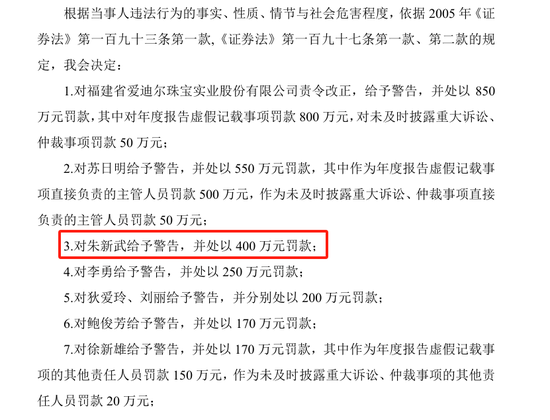 监管认为,朱新武作为时任副董事长、董事、董事会秘书,知悉、参与虚增存货、虚增应收账款、 虚增营业收入、不当计提存货跌价准备和不当计提应收账款坏账准备等违规事项,是对爱迪尔相关年度报告虚假记载直接负责的主管人员,且违法情节较为严重,被罚400万元外,还被采取10年证券市场禁入措施。