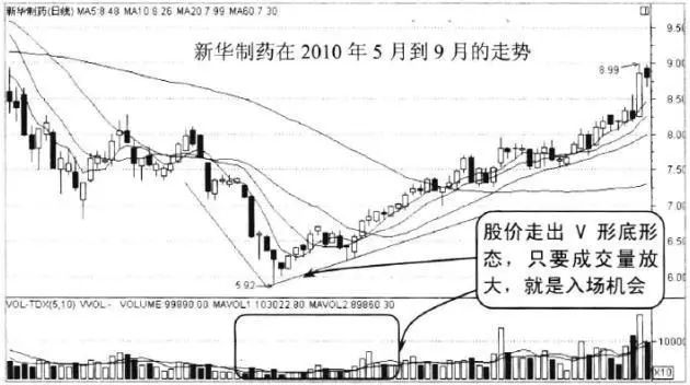 从图中可以看出,该股股性经过一段时间的大幅度下跌,在低位区域形成很明显的V形形态,成交量逐步放大,股价受到均线支撑走出一波上涨行情。