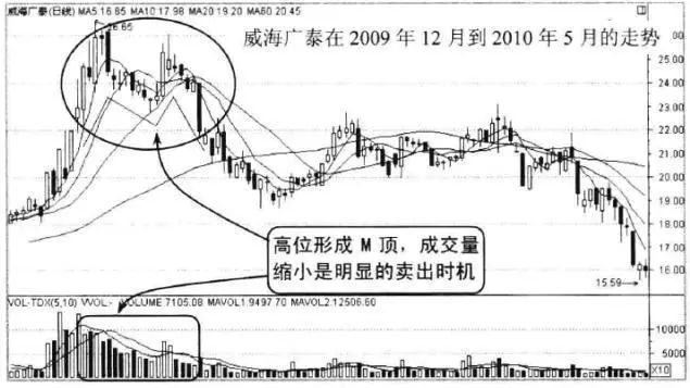 从图中可以看出,该股经过大幅上涨在高位区域形成M顶形态,成交量逐步缩小,短期和中期均线系统高位死叉,这是明显的卖出信号。