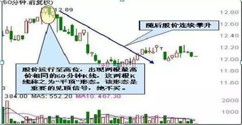 股价运行至高位,上攻受阻,抛压逐渐加重。随后连续两个60分钟K线有相同或极为相近的最高价,这两根K线称之为“平顶”形态。该K线形态形成后,意味着短期上攻受阻,行情摸高见顶,股价即将反转。不过平顶形态的反转力度较小,通常以阴跌为主。