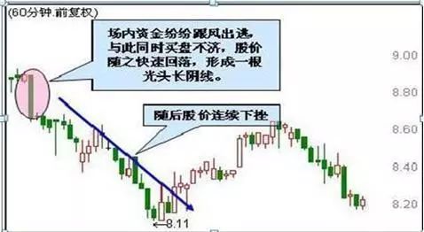 个股在上升趋势中运行,突然某个60分钟内快速拉升,随后抛盘不断涌出,导致股价回落至上一个60分钟K线收盘价附近,留下一根长长的上影线。此K线形态意味着多头积极追高,但高位抛压较重,股价系那个上攀越艰难,行情很可能调头向下。