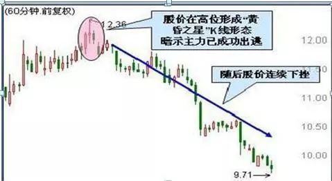 个股加速上涨运行至高位,突然在某个60分钟内加速上攻形成一根长阳线;随后在下一个60分钟内多空力量达到短暂平衡,形成高位十字星;接着大量获利盘兑现,导致股价快速下跌,形成一根阴线。这三根K线组合形态称之为“黄昏十字星”,通常预示着股价即将下跌。