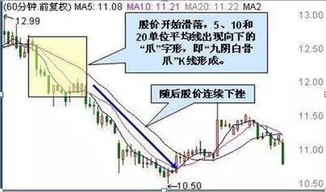当股价形成头部时,必然是庄家大量出货的区间。因此,在60分钟K线图上会连续出现阴线,有时多达九根阴线,称为九阴白骨。在日K线图上出现九根阴线的机会不多,但多阴白骨爪的图形还是挺多的。由于股价开始滑落60分钟K线图上的5、10和20单位平均线会出现向下的“爪”字形,称为九阴白骨爪。