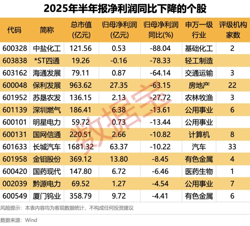与此同时,13家上市公司2025年净利润同比下滑。其中, 中 盐化工 、*ST四通 、海通发展 、保利发展4股净利润降幅较大,依次为88.04%、78.33%、64.14%、63.15%。