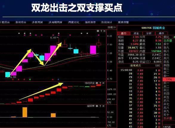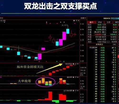 双支撑买点指的是第一缺口支撑和第二智能辅助线支撑。通过民生控股,我们可以看到,连续两个涨停之后,场外资金持续的关注,同时超级大单也出现了明显的抢筹,主力净买额也在持续的流进,在调整当中资金关注,这个时候我们就寻找双支撑买点。第一个买点就是我们提到的缺口的支撑,第二个就是我们提到的智能辅助线的支撑,我们可以看到在民生控股调整过程当中的股价回调到了涨停的缺口的位置,同时也是智能辅助线的位置,在这个位置上有明显的场外资金流进,持续大单抢筹,主力净买额连续的流进,这个时候可以作为我们双支撑的买点进行买入,买入之后,后面也有不错的短线收益。