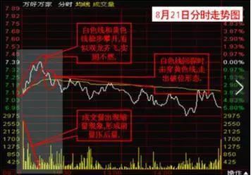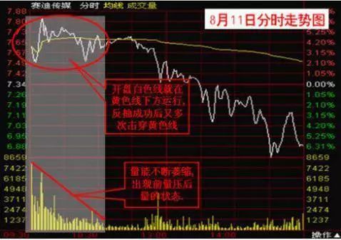 上图我们可以看到:早盘白色分时线和黄色均价线稳步攀升,看似“双龙齐飞“,实则不然,我们看到成交量同期却呈现缩量现象,走出前量压后量的走势,而且在白色分时线回调过程中直接击穿黄色均价线,走出破位形态。