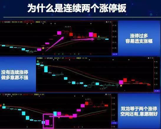 双龙战法的首要条件,就是选取有连续两个涨停板的个股,进行后续方法的操作!因为A股市场是一个单边做多的市场,同时涨停是个股多头意愿最强的体现,双龙战法选取连续两个涨停板,核心因素就是,连续的两个涨停更加坚定了多头对该股做多的意愿,后期看多的信心更加坚定!