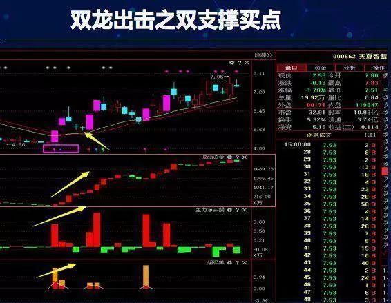 当以上这些条件:两个涨停板的突破智能辅助线,然后回档,流动资金、超级大单、游资同时进入之后,第四个条件就是他要遇到一个双支撑。