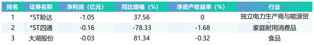 从净亏损来看,*ST聆达、*ST四通、大湖股份排名居前,上半年净亏损金额分别为1.05亿元、0.16亿元、0.03亿元。