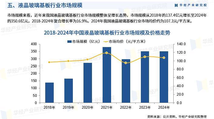 市场规模来看,近年来我国液晶玻璃基板行业市场规模整体呈增长态势,市场规模从2018年的137.4亿元增长至2024年的350.6亿元,2018-2024年复合增长率为16.9%。2024年我国液晶玻璃基板行业市场均价约为107.3元/平方米。