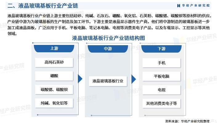 液晶玻璃基板行业产业链上游主要包括硅砂、纯碱、石灰石、硼酸、氧化铝、石英粉、碳酸锶、碳酸钡等原材料的供应。产业链中游为为玻璃基板的生产制造及加工环节。下游主要是液晶显示器件生产商,他们将中游制造的玻璃基板进一步加工成液晶面板,广泛应用于手机、平板电脑、笔记本电脑、电视等消费类电子产品,以及车载显示、工控显示等其他领域。