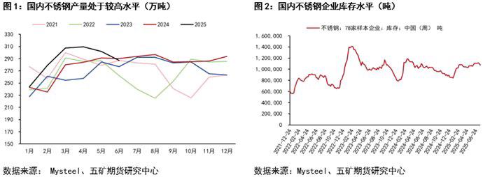 短期来看,引发不锈钢价格反弹的现实路径在于投机需求对于需求端的短暂改善。近期不锈钢价格回升背景下,市场出现部分投机需求,导致不锈钢库存短期小幅去化。但应该认识到,不锈钢库存依旧处于较高水平,这将限制价格向上的弹性。截至2025年7月17日,全国主流市场不锈钢89仓库口径社会总库存为114.8万吨,周环比减少1.69%。社会库存消化速度依旧缓慢,且从历史数据来看,当前库存仍处于相对高位。供给方面,虽然7月存在一定减产预期,但减产力度整体仍不及预期。7月份全国43家不锈钢厂预计排产量为326.8万吨,环比减少0.7%,同比减少1.2%。因此,在库存高企、供给未见大幅收缩的背景下,我们对本轮反弹高度依然较为悲观。