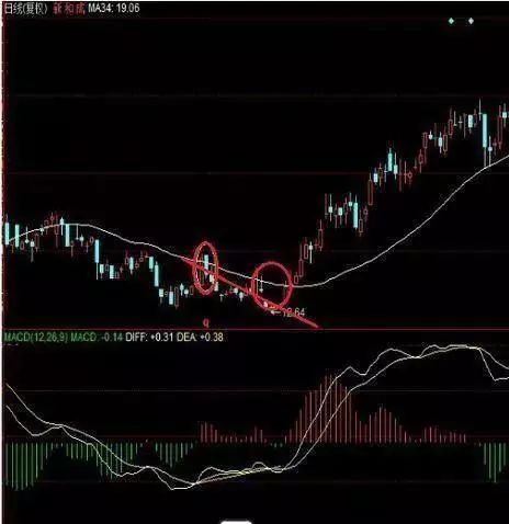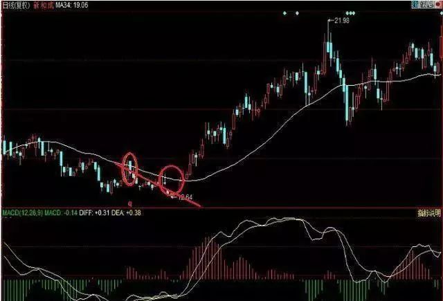 主要看的是股价与均线的关系,如果出现, 则能提高成功率,但也不一定要求出现。下图是34日均线在底部附近与股价的关系, 在第二底之前不远处。股价曾经触及均线。这一特征,加强了底部的可靠性。