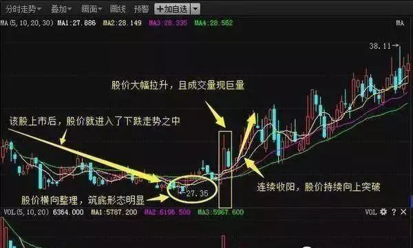 从上图中可以看出,该股上市之后就步入了下跌走势之中,股价一路下探到了27.35元才止跌回升。股价探底27.35元成功,之后步入上涨走势之中。图中方框区域内股价大幅拉升,成交量现巨量,由此可见市场资金在大举建仓,发出了短线看涨买入信号,在大幅拉升且放巨量之后,股价向下回调,之后更是连续收阳线向上突破,短线买入信号更加强烈,所以投资者可以放心地进行短线买入操作。