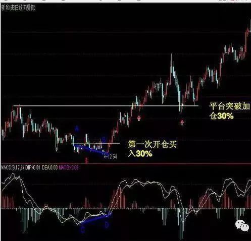 底部确认我们就要采取行动了。采用分批 买入原则,一次全部投入无异于自杀。在 升至第一底部位置时候,且股价站在34周 线上建仓30%!