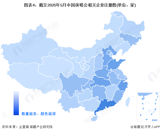3、中国演唱会产业链区域热力地图:人口密集、经济发达地区企业数量较多通过企查猫检索国标行业“文艺创作与表演(R8810)、艺术表演场馆(R8820)、文化活动服务(R9051)、文化娱乐经纪人(R9053)、其他文化艺术经纪代理(R9059)”、登记状态为“存续/在业”的企业,截至2025年5月30日,中国相关企业有48.45万家,从演唱会产业链代表性企业的区域分布情况来看,广东省内企业数量最多,超5万家;其次是浙江、山东、湖北及河北省,省内演唱会业企业数量分别为3.61、3.52、3.43和3.08万家,排名全国第二至五位,前五省合计占比全国演唱会企业数量的38.3%。