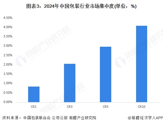就国内市场格局来看,除少数龙头企业与外资企业外,中国包装产品生产企业多数规模较小、技术水平较低,缺乏自主创新能力,从而导致行业低端市场竞争的无序,产品主要以低档次、低附加值产品为主。目前,我国包装行业竞争格局十分分散,行业仍处于完全竞争的市场阶段。基于行业代表性企业2024年营业收入和市场规模,前瞻初步测算2024年我国包装行业CR10市场份额未超过5%。整体来看,包装行业企业竞争较为分散,行业龙头企业市场份额较低,行业集中度有待进一步提升。