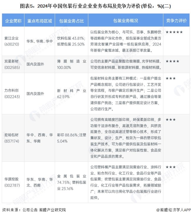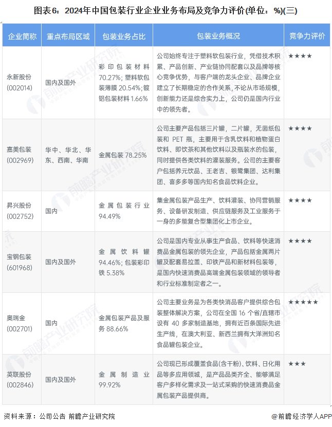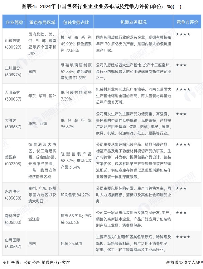 目前,我国包装行业的企业主要分为玻璃包装企业、纸质包装企业、塑料包装企业和金属包装企业。其中,玻璃包装代表企业有山东药玻、正川股份等;纸质包装代表企业有万顺新材、山鹰纸业、森林包装等;塑料包装代表企业有通产丽星、宏裕包材、双星新材等;金属包装代表企业有昇兴包装、嘉美包装、奥瑞金等。